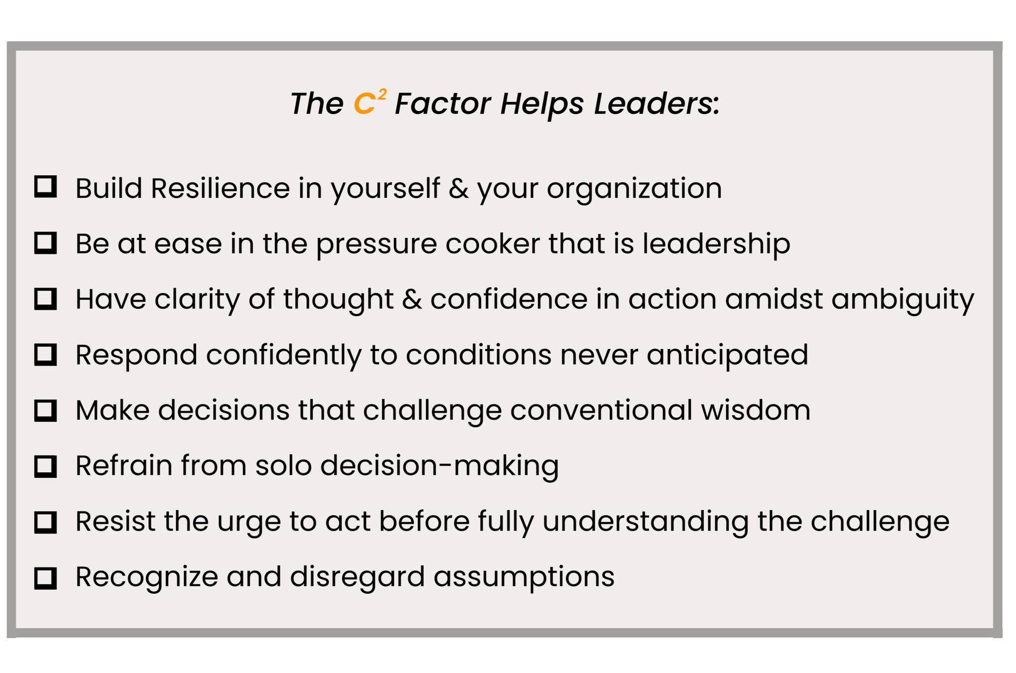 Every leader can create the enduring resilience, clarity of thought, and confidence in action necessary to successfully navigate the ever-shifting landscape and tumult of current times. We all have curiosity and courage – no matter how underused or undeveloped. When we learn how to build and strengthen those traits, like muscles, we can then deliberately deploy them in a way that helps us rise above the chaos of uncertainty. The magic is in the alchemy of these traits. Courage without curiosity is reckless. Curiosity without courage is merely academic. But, when woven together, one building on the other, you find the magic that is the C² Factor.